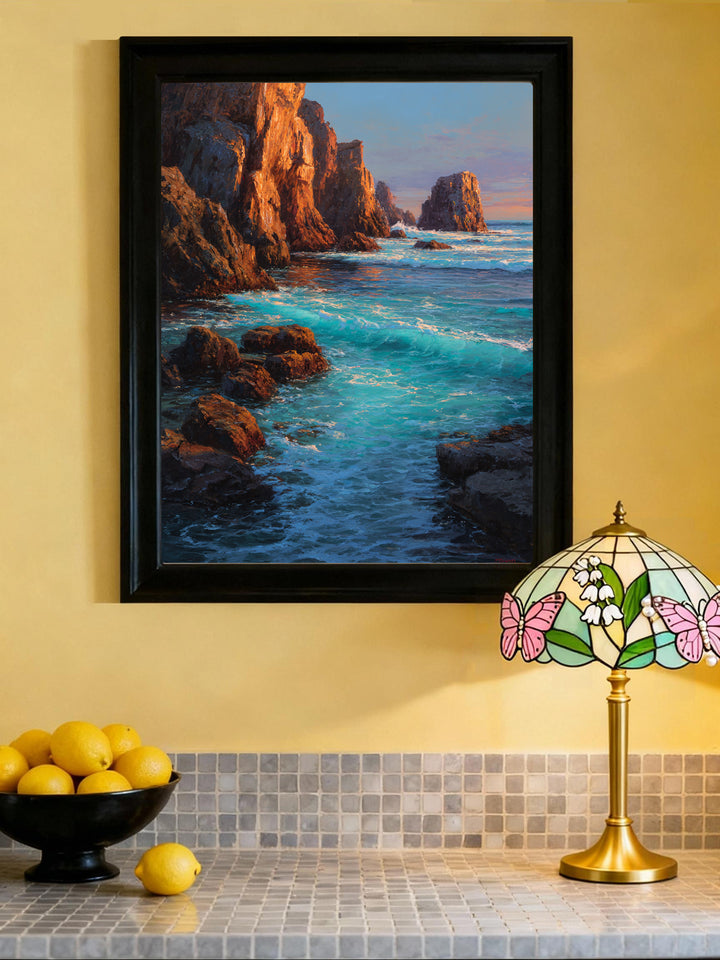● 🎨 Vibrant Contrast – Fiery cliffs meet cool ocean hues, perfect for dramatic wall art.