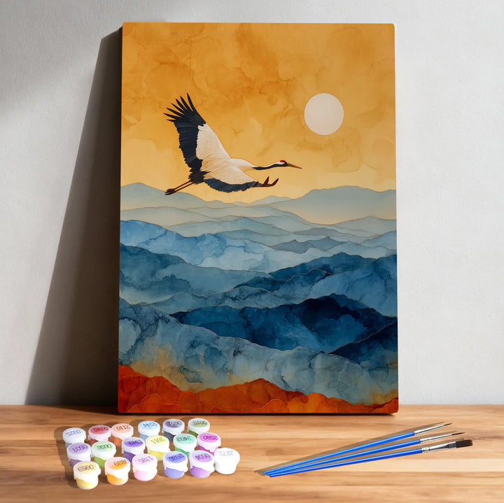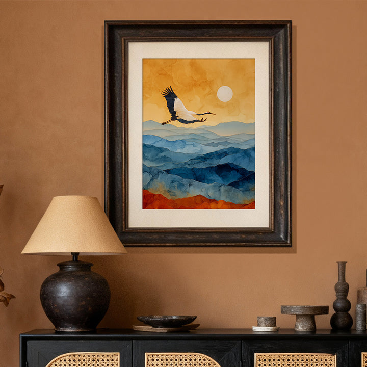 Crane Over Misty Mountains blends traditional ink-wash serenity with modern color flow—