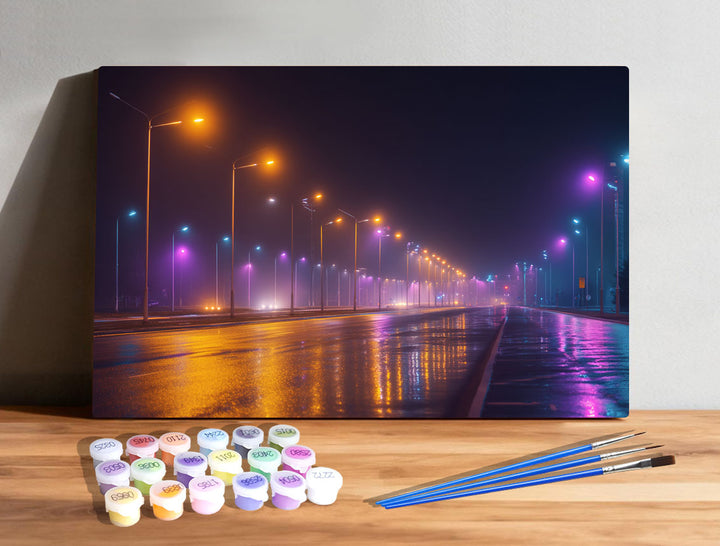 Aurora Avenue Paint by Numbers | Neon Streetlights & Rainy Night Reflection Scene