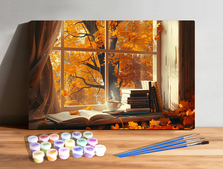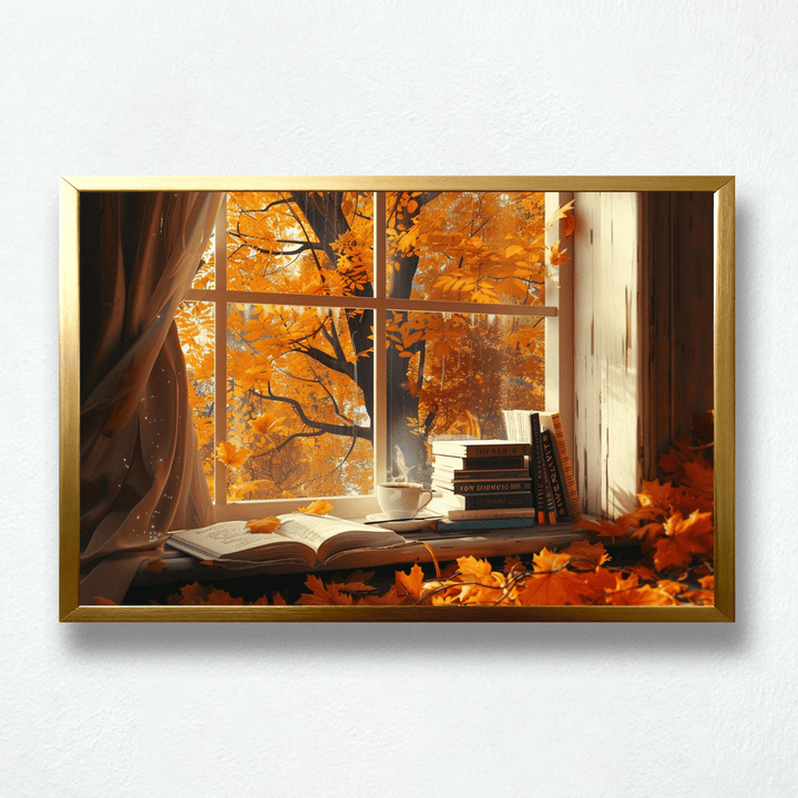 ● 🍁 Golden Fall Window Scene – A tranquil blend of nature and warmth.