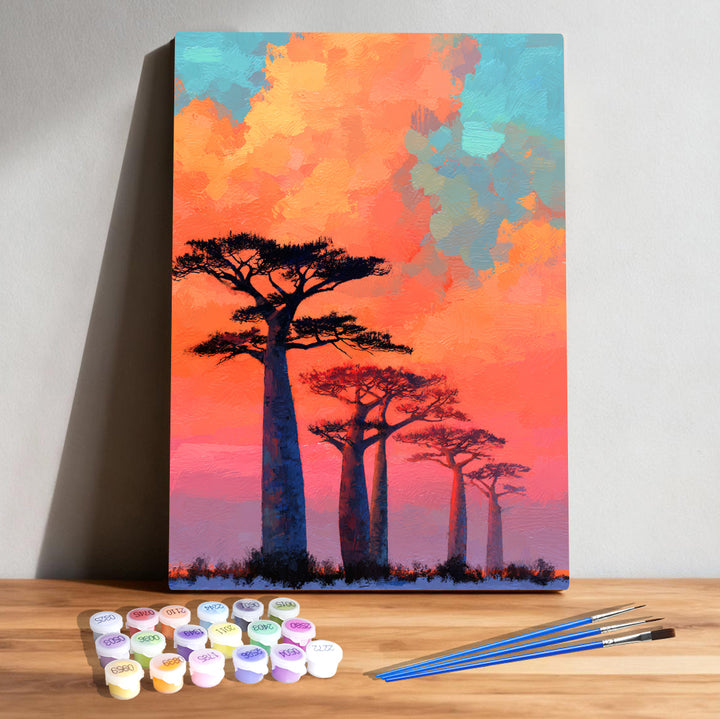 🌅 Baobab Silhouette Glow Paint by Numbers Kit | Madagascar Sunset | PaintEasy