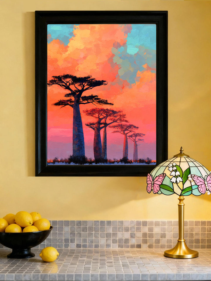 Baobab Silhouette Glow captures the iconic baobab trees standing tall against a vivid sky—layers of coral, pink, lavender, and teal blending like a painted sunset.