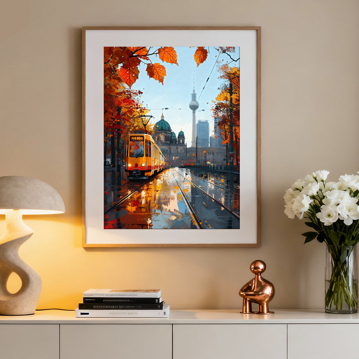 A dreamy Berlin street in autumn, glowing with orange leaves, reflections, and a classic yellow tram. This travel-inspired art print adds warmth, color, and European charm to any space.