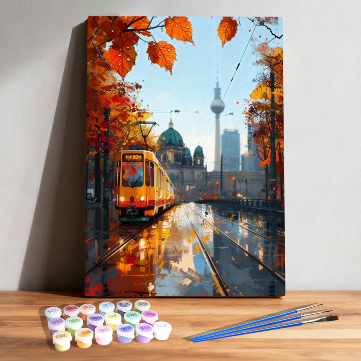 This paint-by-numbers kit captures a bright yellow tram, glowing fall trees, and soft city reflections—perfect for relaxing, gifting, and decorating your space with cozy travel vibes.