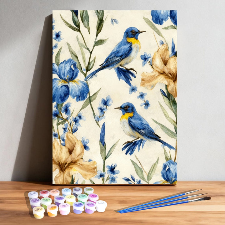 A calming paint by numbers kit featuring delicate bluebirds and iris flowers in soft watercolor tones. Perfect for peaceful home decor, mindful painting, and creating a gentle botanical atmosphere.