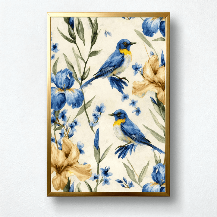 ● 🕊️ Peaceful Nature Composition – Bluebirds among iris blooms create a gentle visual calm.