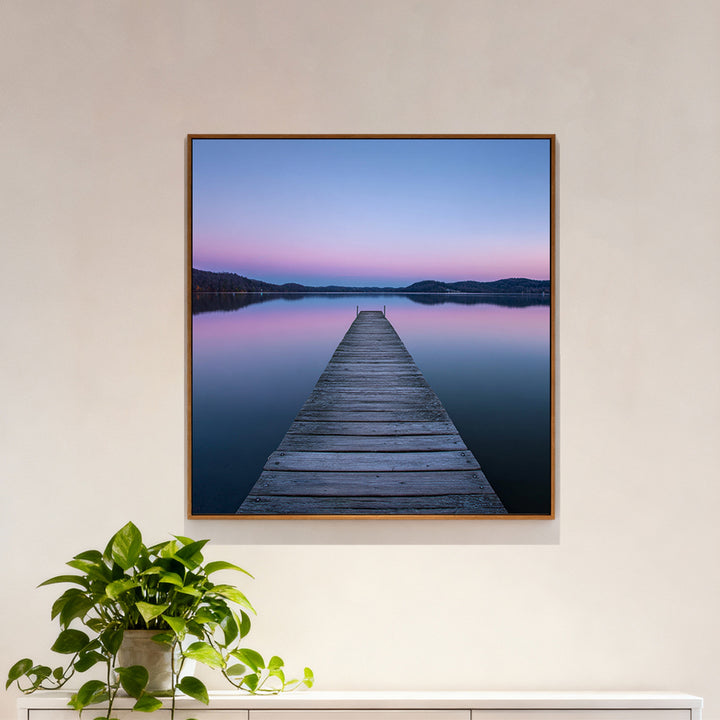 Blue Hour Lakeside Path captures the stillness of a wooden pier stretching into a mirror-calm lake,