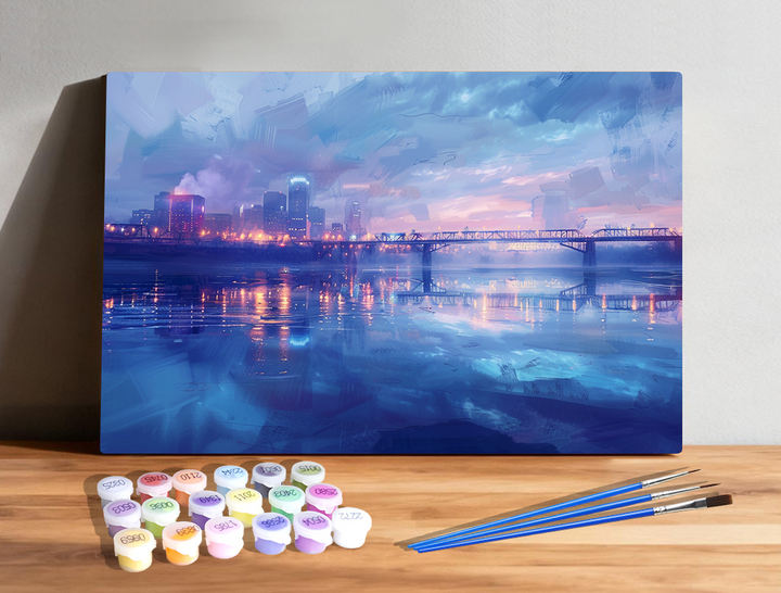 Blue Hour Symphony Paint by Numbers | City Bridge at Dawn | PaintEasy®