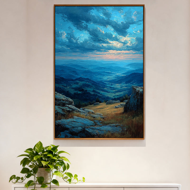 “Blue Ridge Dawn” captures the serenity of a morning high above the world — where mountains stack like ripples, the sky slowly brightens, and silence feels endless.