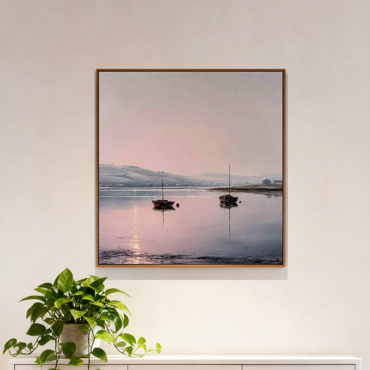 Blush Evening Sailboats captures a quiet pastel sunset over calm waters, with two sailboats drifting gently in the fading light.