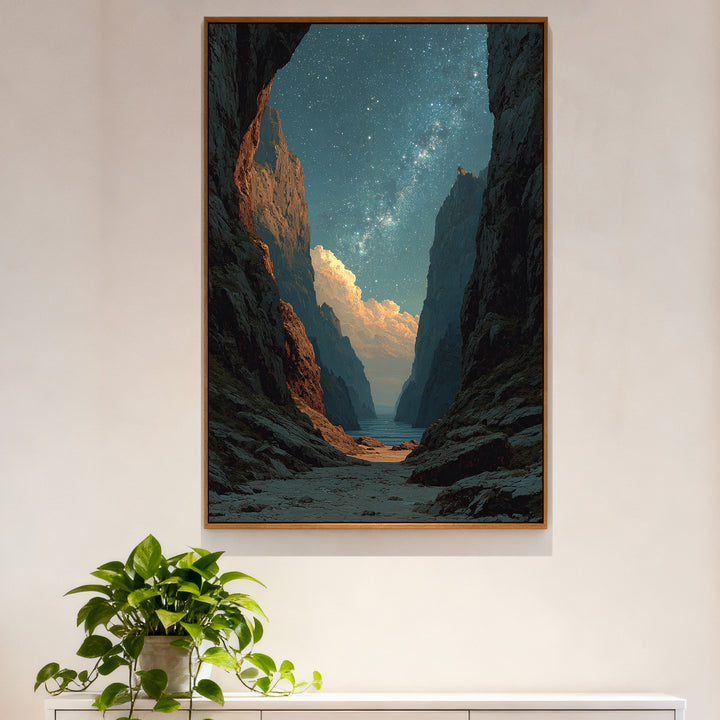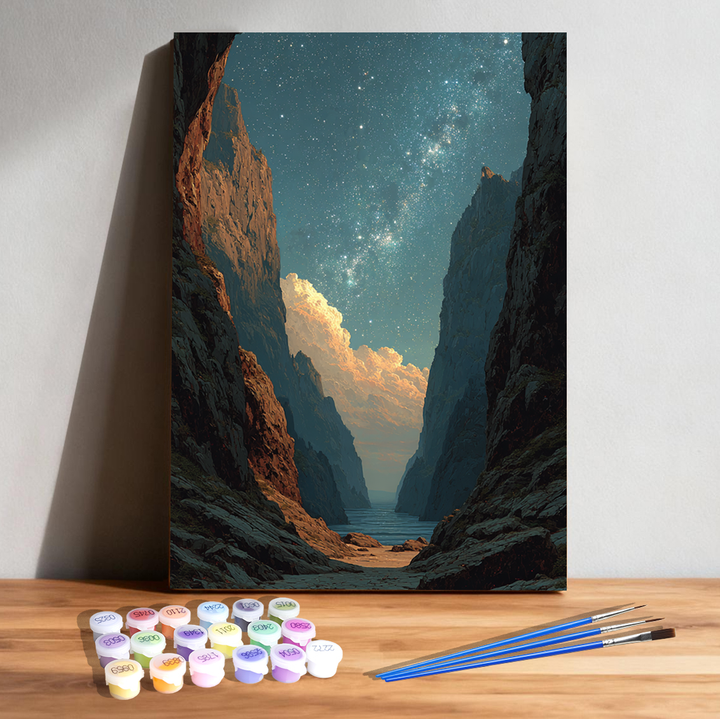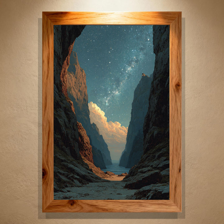 “Celestial Canyon” draws you into a towering gorge where rugged cliffs rise like ancient guardians, and the Milky Way glows above in soft cosmic brilliance.