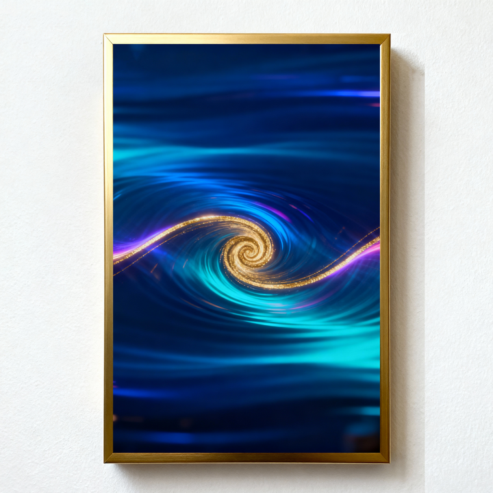 a golden spiral gliding through waves of sapphire and teal.