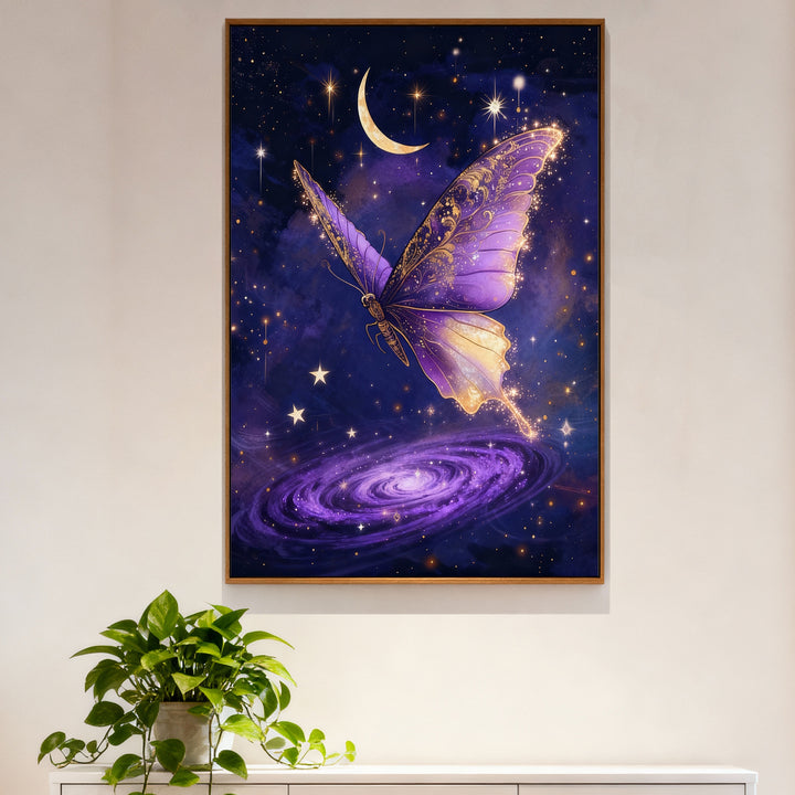 Celestial Galaxy Butterfly captures a radiant purple-gold butterfly soaring through a midnight sky,