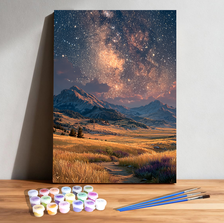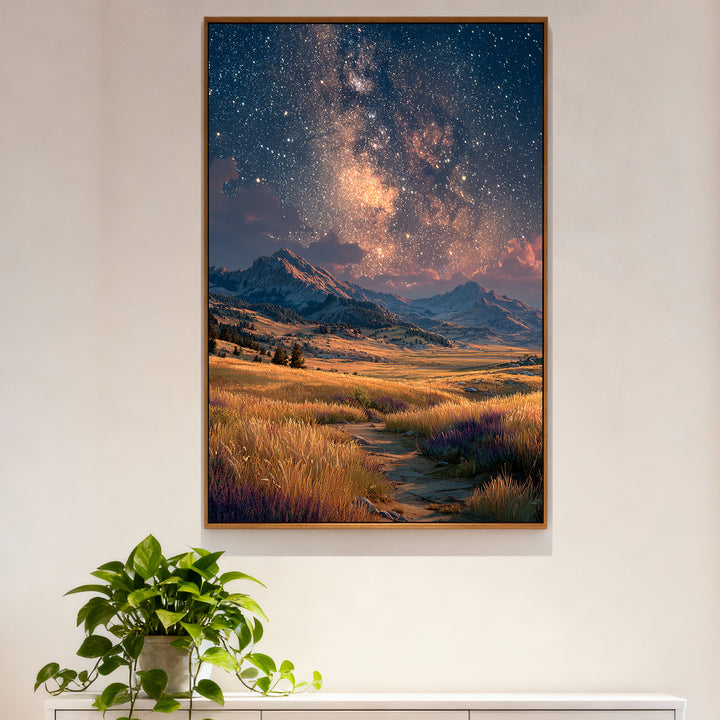 “Celestial Meadow” captures the quiet infinity of a mountain valley under a glowing Milky Way — golden stars, violet meadows, and a path that leads into the heart of night.