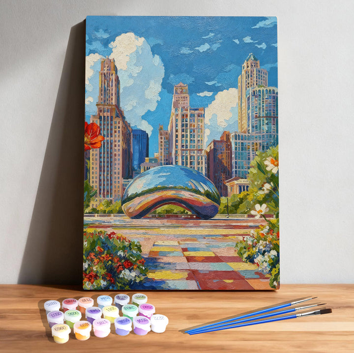 Paint Chicago’s iconic Cloud Gate with a bright skyline, sunny skies, and vibrant garden colors. A relaxing Paint by Numbers kit for city lovers and travel dreamers.