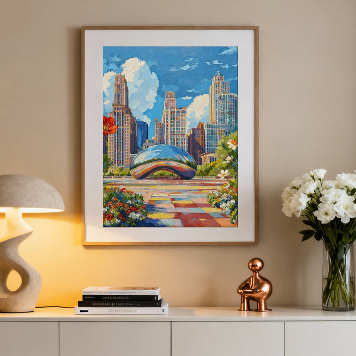 The scene blends nature, architecture, and art into a cheerful city moment—perfect for anyone who loves Chicago, colorful skylines, or feel-good travel memories.