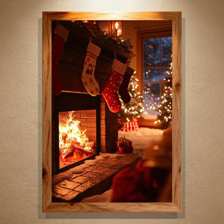 The fire crackles softly, stockings sway in golden light —