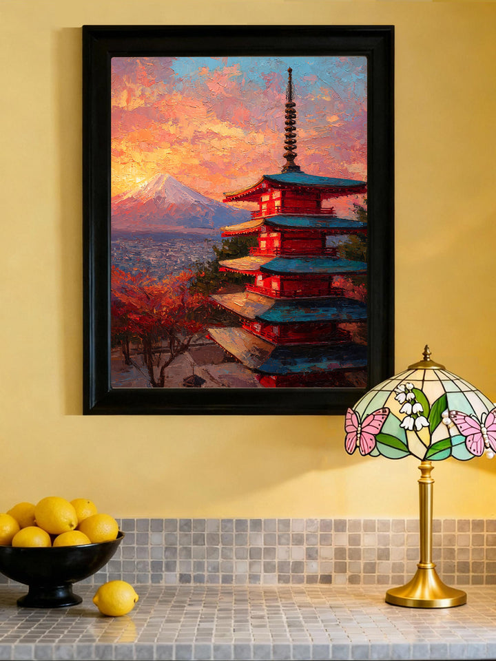 This painting captures the breathtaking harmony of Mount Fuji, blazing evening skies, and the red tiers of Chureito Pagoda.