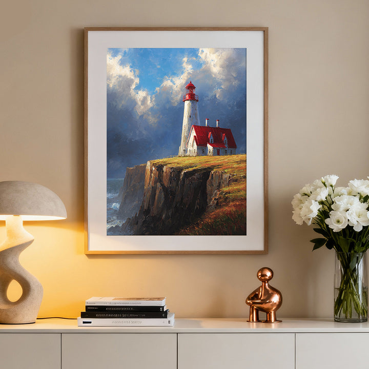 Standing tall against a stormy sky, this classic lighthouse overlooks rugged cliffs and crashing waves—an inspiring scene filled with strength, warmth, and adventure.