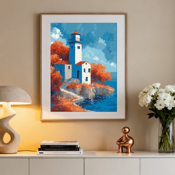 This artwork features a tall, elegant lighthouse rising above a cluster of white stone buildings with terracotta rooftops. A staircase leads down the rocky cliffside, overlooking calm blue waters. Behind the structure, lush orange foliage adds warmth and contrast to the rich blue sky layered with textured clouds.