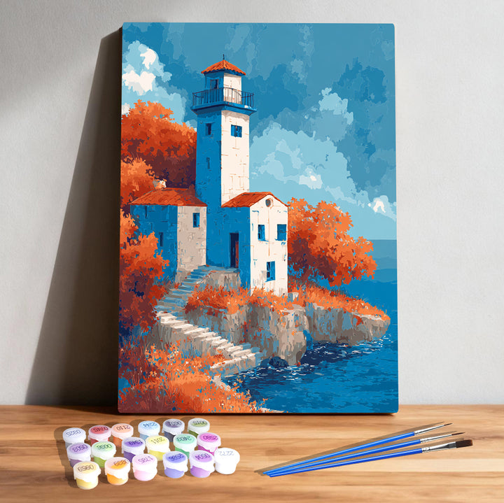 Create a striking coastal lighthouse painting with bold blues and warm orange foliage. A relaxing paint-by-numbers kit perfect for beginners and enthusiasts.