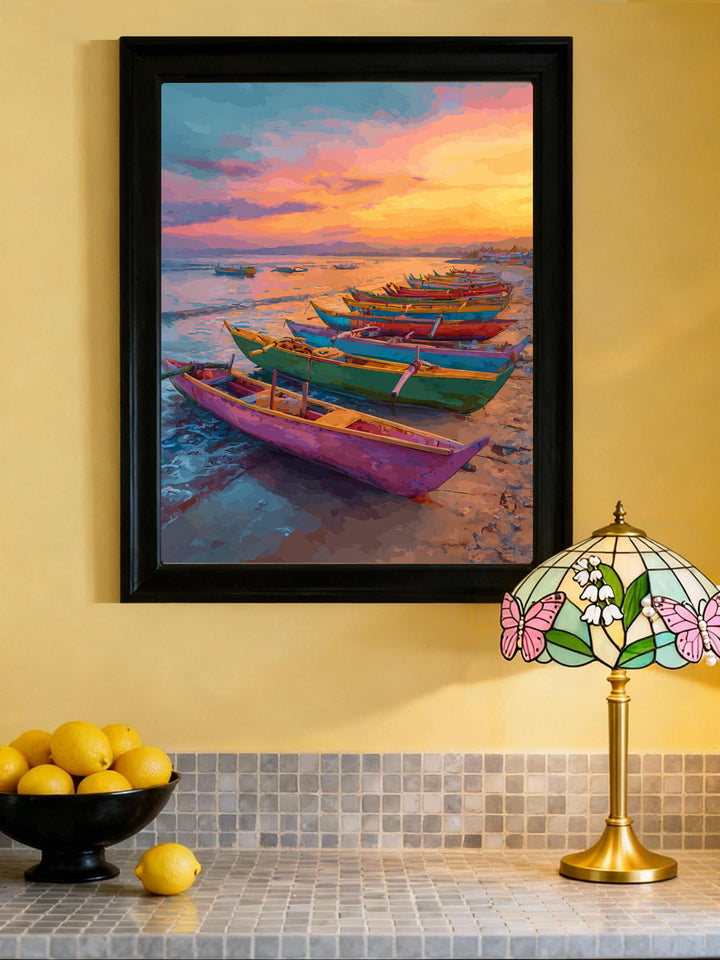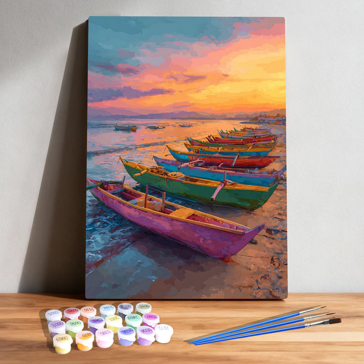 🌅 Colorful Malagasy Boats Paint by Numbers Kit | Sunset Shoreline | PaintEasy