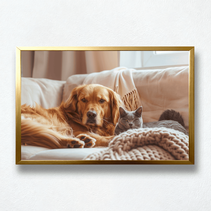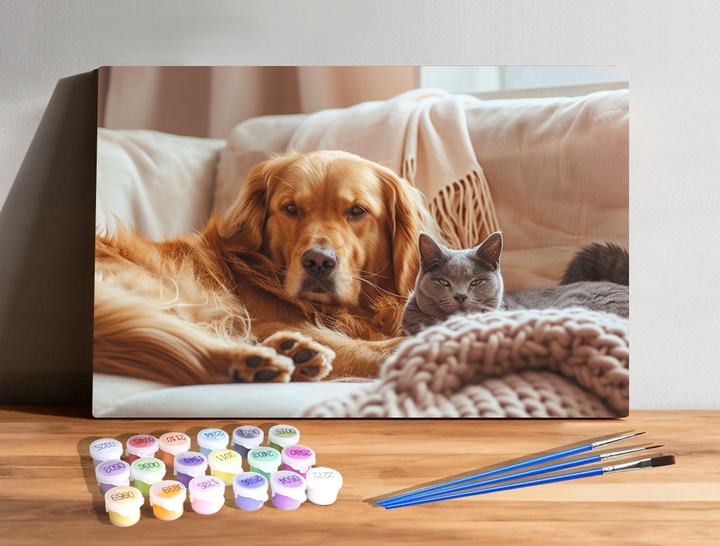 Cozy Companions Paint by Numbers Golden Retriever & Gray Cat on Sofa