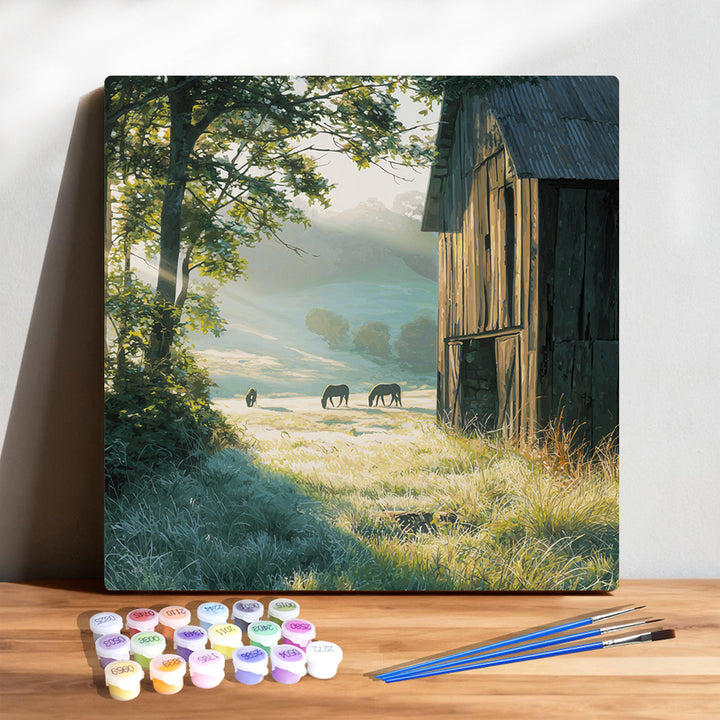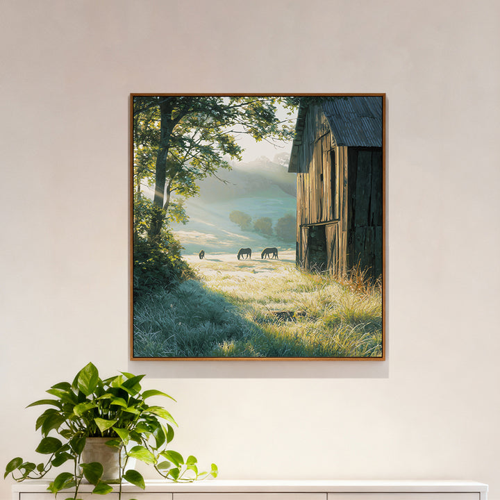 Dawn Pastures captures a quiet countryside morning — warm sunlight spilling through trees, a rustic wooden barn glowing softly, and three horses grazing in a misty meadow.