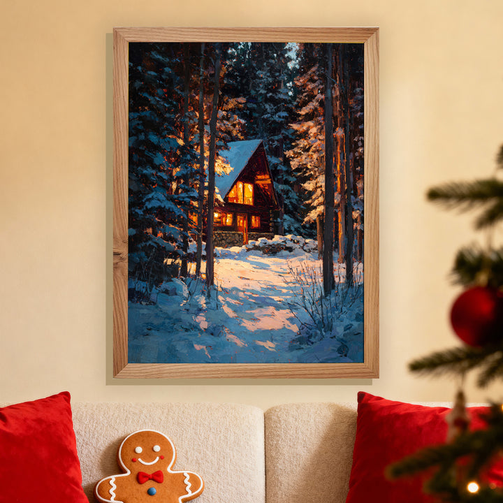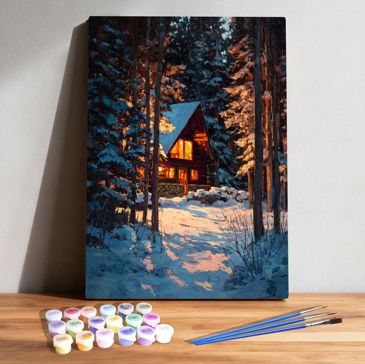 Winter Glow Cabin captures the magic of a snowy forest eveningātowering pines, deep blue shadows, and a warmly lit cabin nestled safely between the trees.