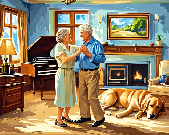 Diamond Painting:Golden Years Waltz A Cozy Dance by the Fireplace with Loyal