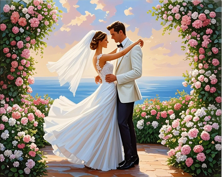 Diamond Painting:Tender Embrace by the Azure Sea with Blooming Pink Roses