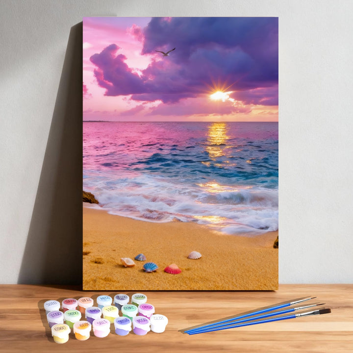 Experience “Dream Coast,” a pink sunset beach paint-by-numbers kit that blends ocean calm with pastel beauty. Paint serenity, romance, and gentle evening light.