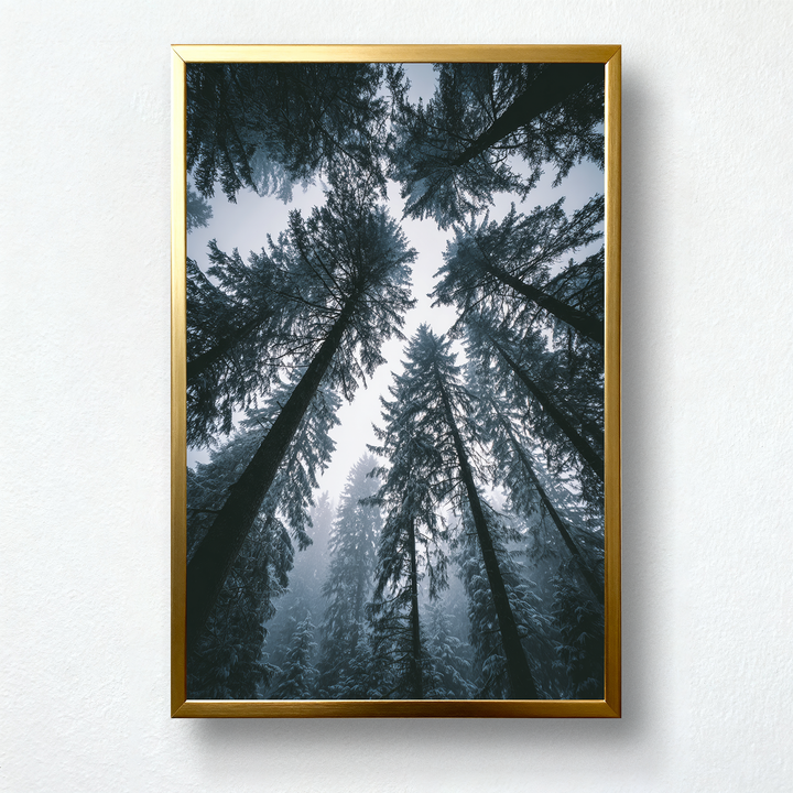 ● 🌲 Cinematic Forest Composition – Upward perspective through mist-shrouded pines.