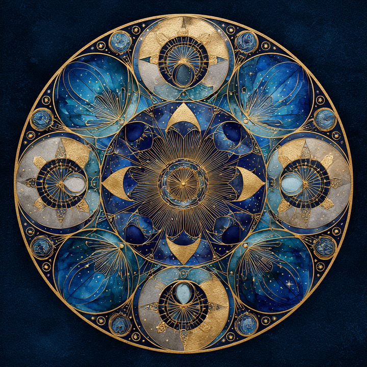 Ecliptic Flow – Moon Phase Mandala Paint by Numbers | Blue & Gold Cosmic Wall Art