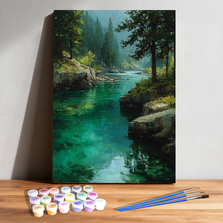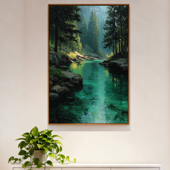 “Emerald Creek” captures the quiet magic of a hidden river — crystal-clear emerald water, towering pines, and gentle sunlight breaking through the canopy.