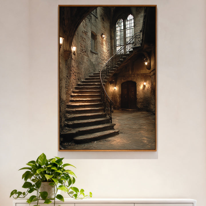 Weathered stone steps curl upward like a memory, while the wrought-iron railing leads the eye toward tall arched windows washed in pale daylight.