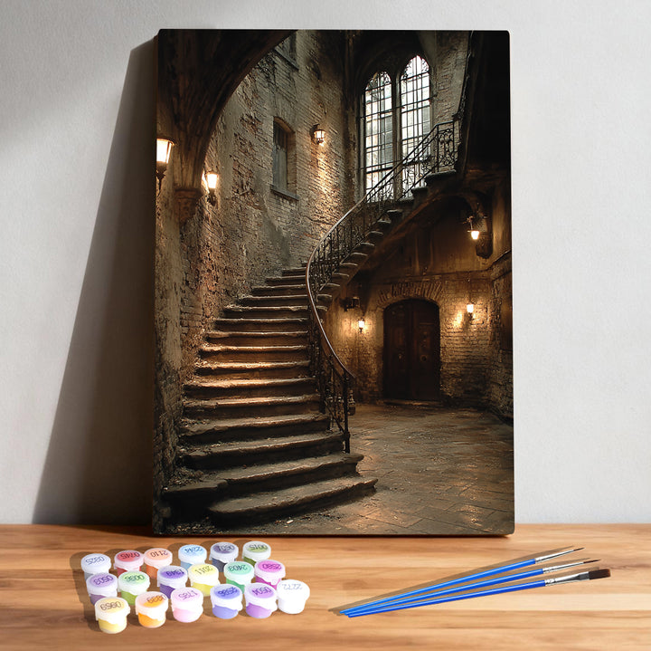 ● 🪜 Curved Stone Staircase – Organic shapes add flow and depth to the painting.