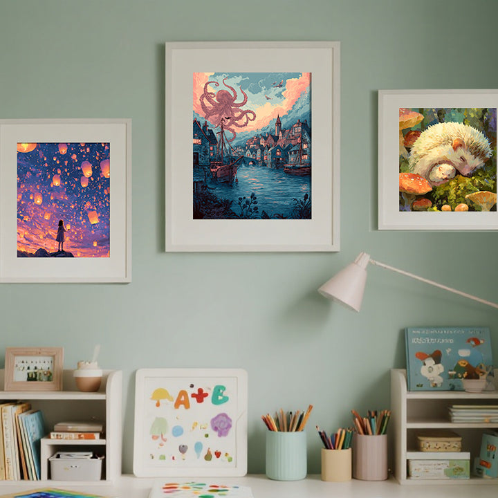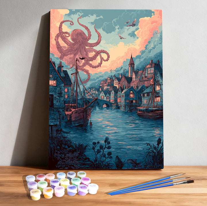 Giant Octopus Over Harbor Town – Kids Paint by Numbers Kit | PaintEasy