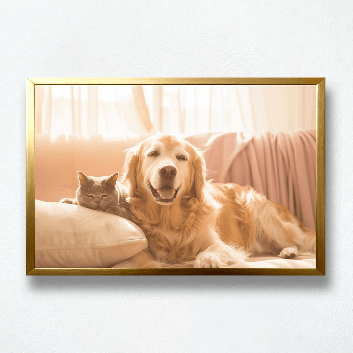 Golden Companions captures the gentle bond between a golden retriever and a sleepy cat,
