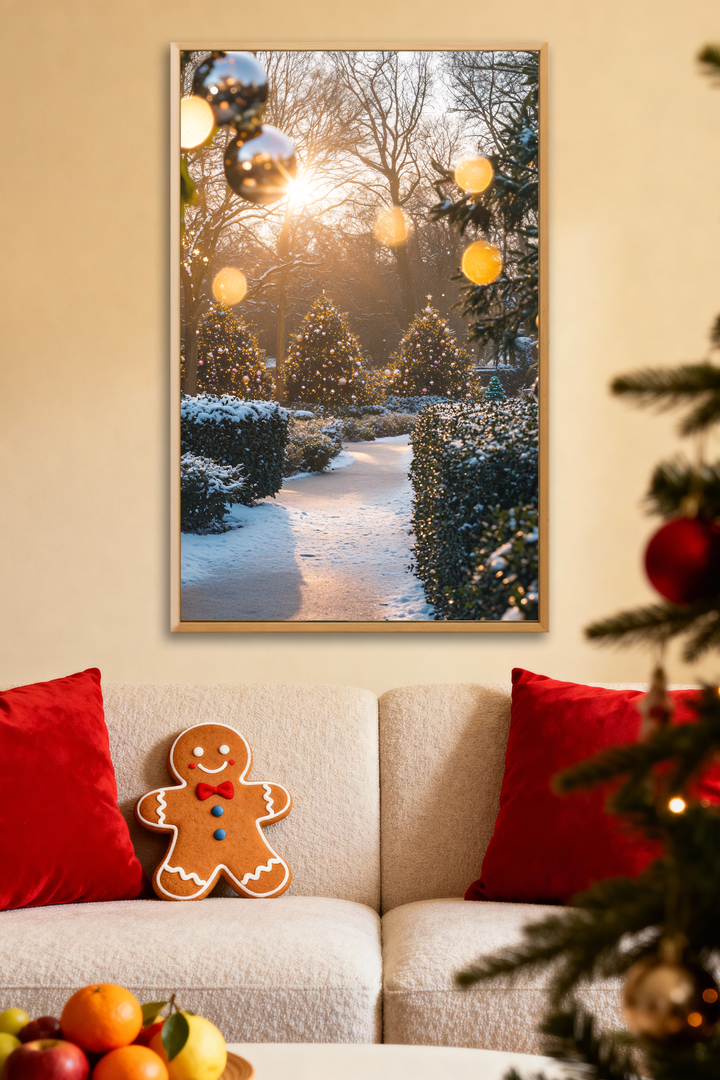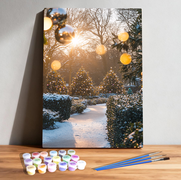 Golden Dawn Paint by Numbers | Morning Sun Over Snow Garden & Christmas Trees | Frost Luxe Collection by PaintEasy