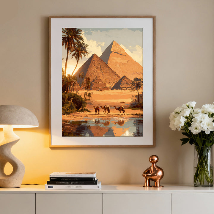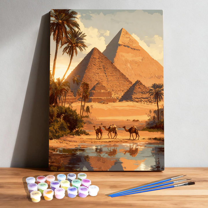 Paint a warm, golden Egyptian landscape featuring towering pyramids, a tranquil oasis, and a camel caravan. Relaxing, travel-inspired, beginner-friendly Paint by Numbers kit from PaintEasy.
