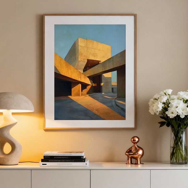 Warm gold shadows stretch across angular concrete forms, turning hard edges into soft, cinematic shapes.