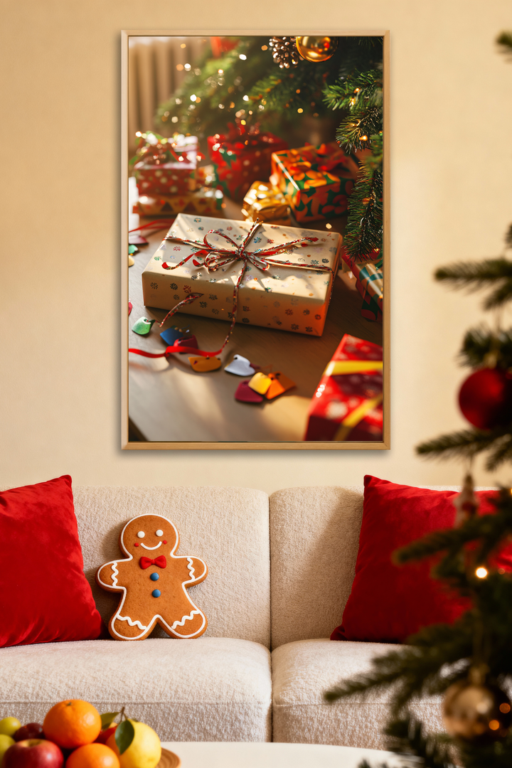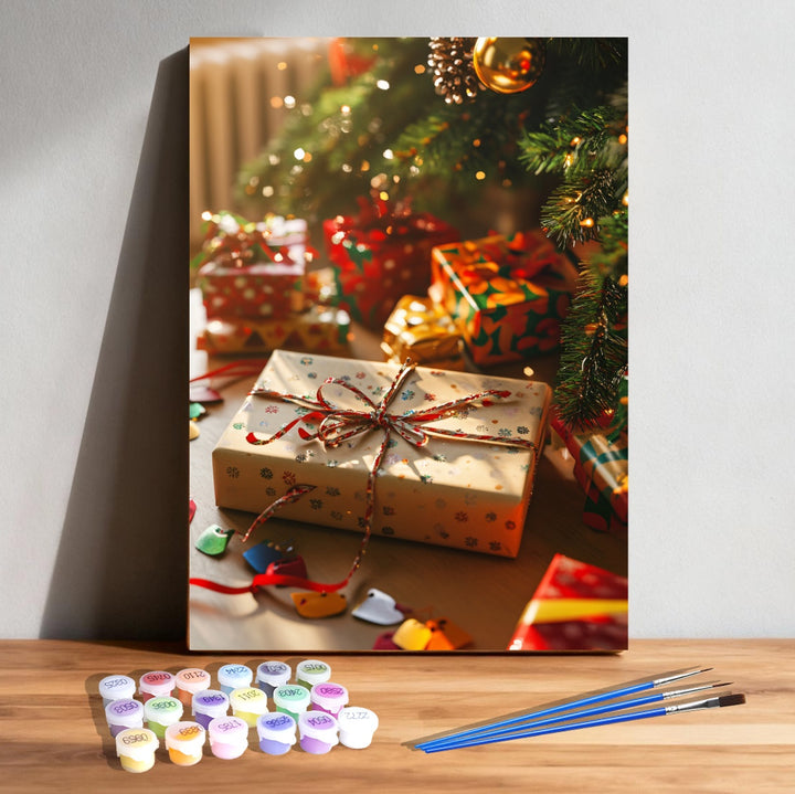 Warm sunlight, sparkling ornaments, and the joy of wrapped surprises capture the essence of holiday wonder — perfect for cozy painting days or family art time.
