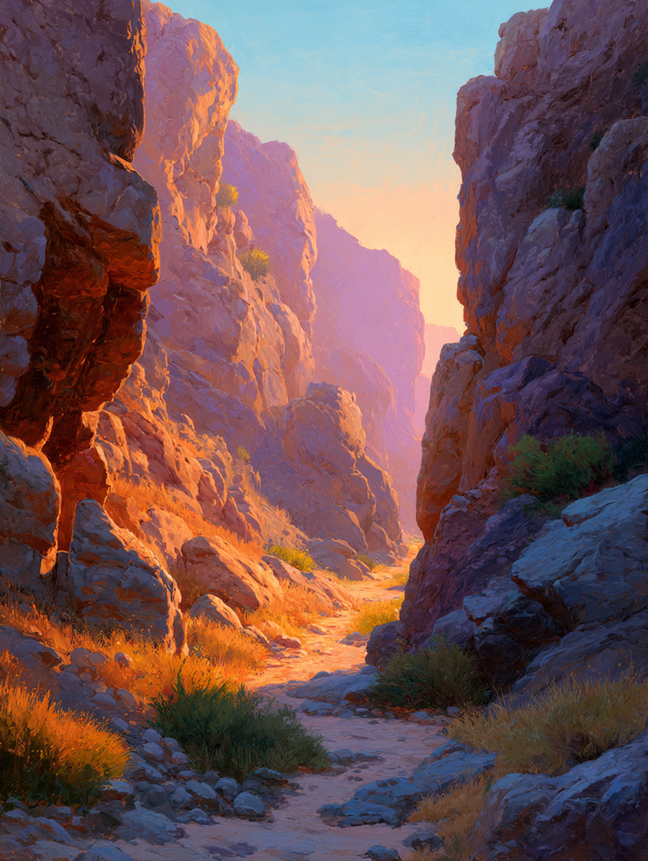 ● 🌅 Sunlit Canyon Composition – Warm golden rays meet cool lavender shadows in perfect balance.