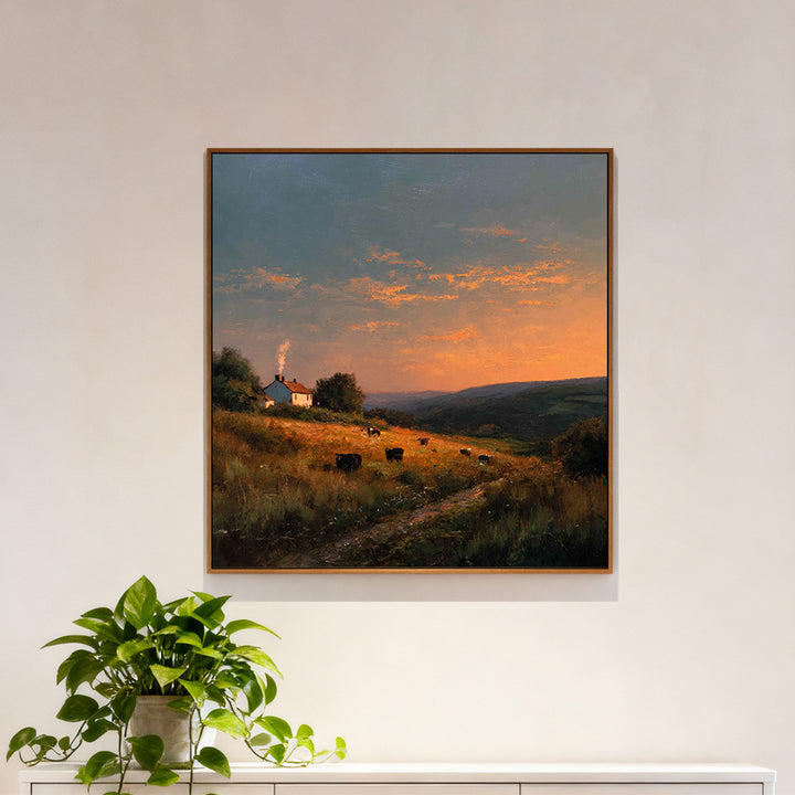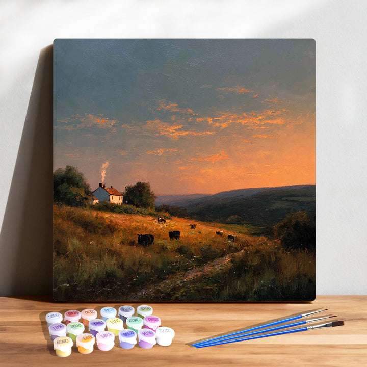Golden Pasture paints a warm countryside sunset — glowing fields, slow-moving cows, distant blue hills, and a small white farmhouse with smoke curling gently from the chimney.