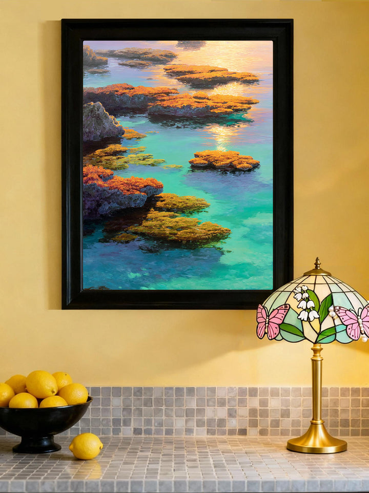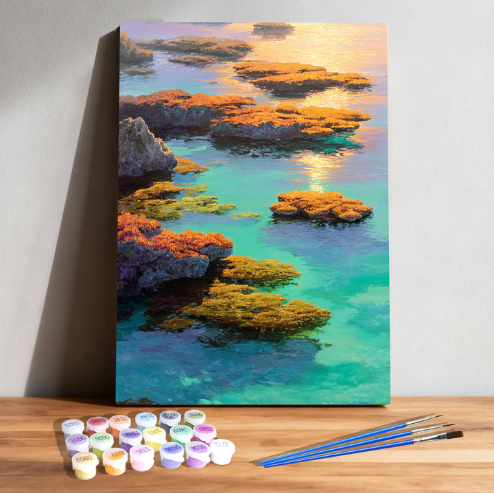✨ Paint a glowing reef where clear waters, warm corals, and sunset light come together in quiet harmony.