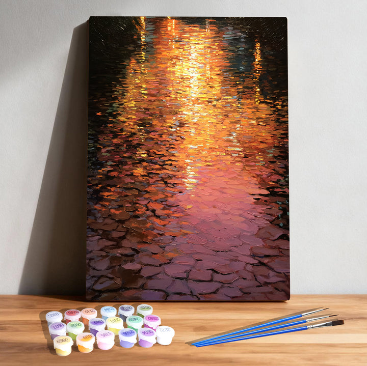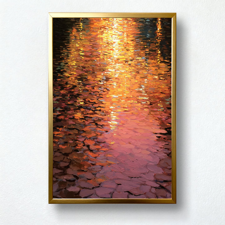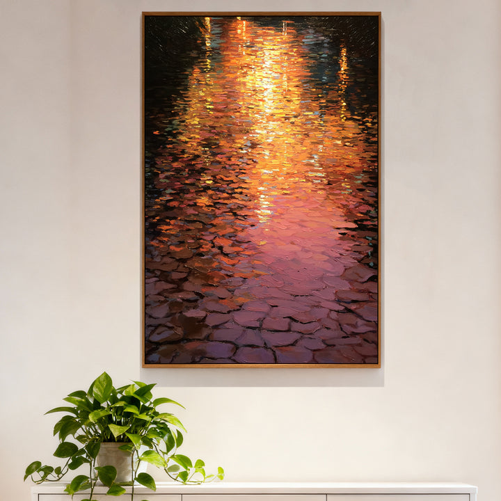 Golden Reflections captures the quiet magic of a sunset mirrored on wet cobblestones—