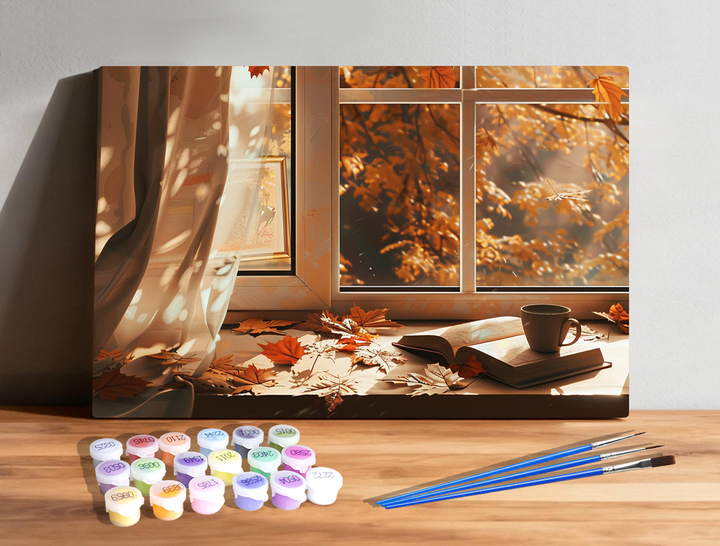 ● 🍂 Serene Fall Window Scene – A glowing view framed by amber leaves.