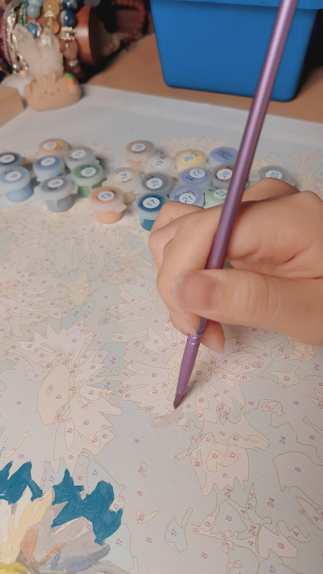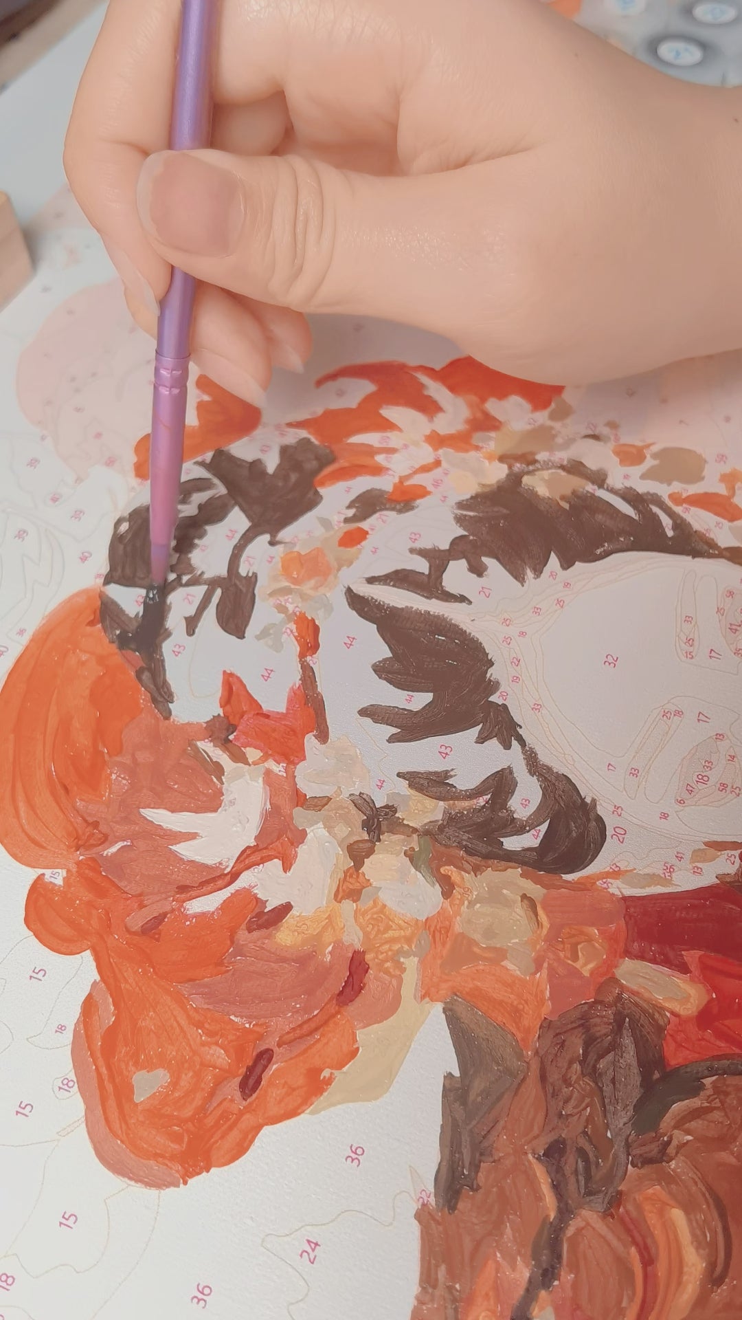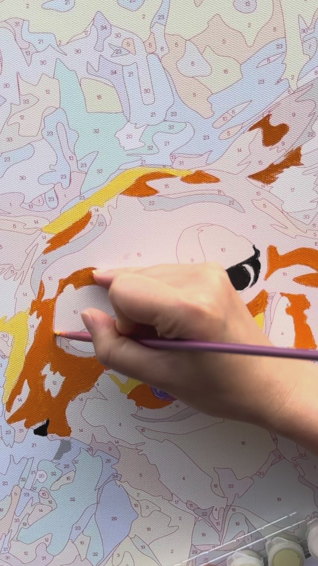 During the painting process, the PaintEasy Paint by Numbers canvas reveals the composition gradually through clearly defined numbered color sections. The feather background contains repeating shapes that allow painters to build the layered fan structure step by step. The circular feather markings introduce small color variations that gradually form the distinctive “eye” patterns across the tail. Meanwhile, the peacock’s body introduces more defined color blocks that emphasize the curve of the neck and the detailed head features. As each section is completed, the full feather display becomes increasingly visible, showing how the individual patterns combine to form the finished image. 🎨