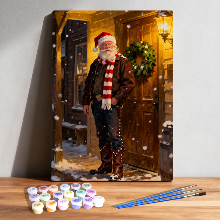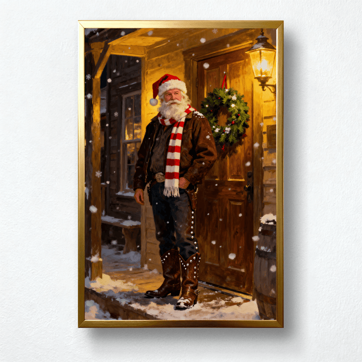 ● Western Christmas Warmth – Leather jacket Santa under golden light.